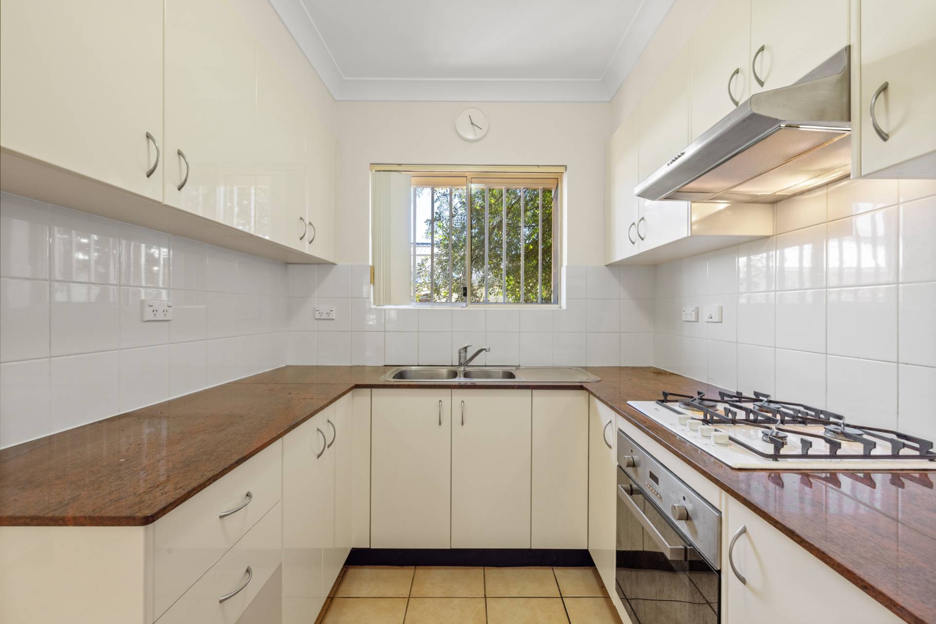 • A bright, clean kitchen with gas cooktop
